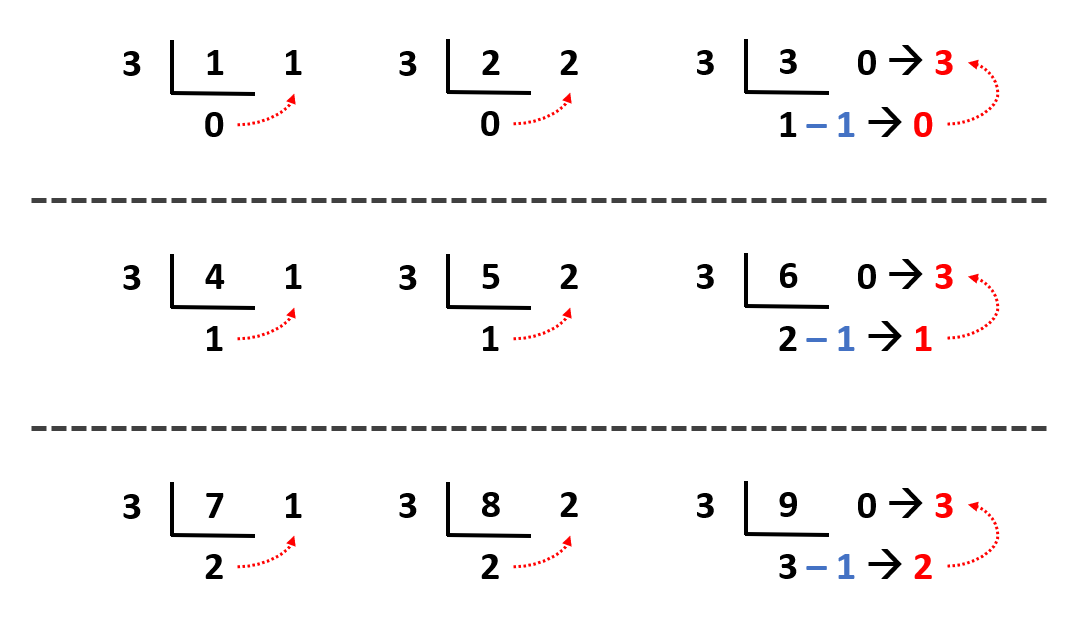 먼저 3진법으로 변환할 때 나머지가 0인 경우 해당 값을 3으로 변환합니다. 그리고 몫에서 1을 빼줍니다.